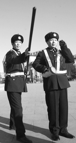 昨日下午,沈阳市中山广场,数名社防队员列成一队肃立。