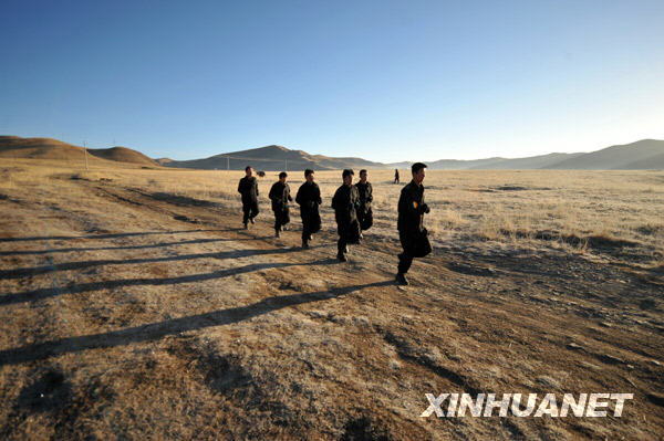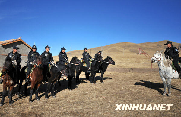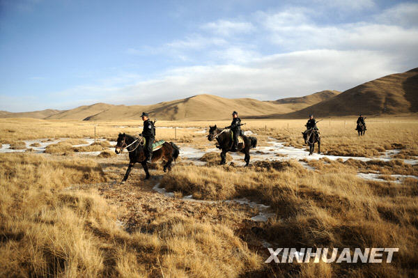 12月24日,骑警队在草原上巡逻。 甘肃省甘南藏族自治州玛曲县由于地广人稀,社会治安难度较大,玛曲县公安局2003年成立了一支由20名汉、藏民警组成的草原骑警队,骑警队常年驻扎在草原深处,在面积超过1万平方公里的玛曲草原上定期巡逻,为牧民追回被盗牛羊、调解纠纷,抓捕逃犯,成为牧区的守护神。新华社记者 聂建江 摄