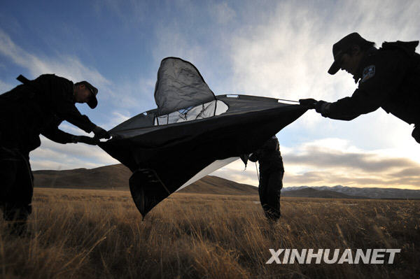 12月24日,两名骑警队员巡逻途中在草原上搭建帐篷准备过夜。新华社记者 聂建江 摄