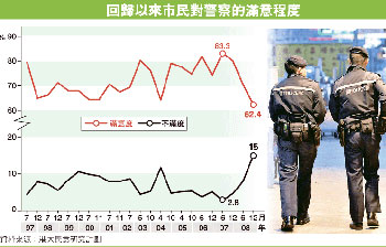 据香港《明报》报道,香港大学民意网站最新调查显示,市民对警队的满意程度大幅下跌,较9月时下跌8%,至62%的回归后新低,不满度也上升了7%,至15%。港大民意研究计划主任钟庭耀认为,这可能与警务人员涉及风化案有关。