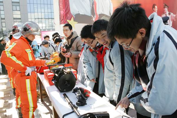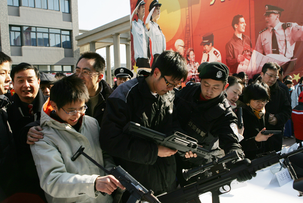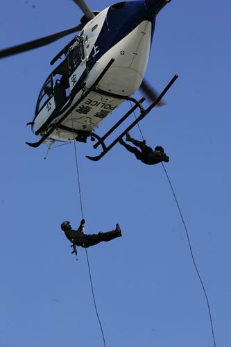 1月10日,上海市公安局在公安高等专科学校举行2009上海公安机关“警营开放活动”,邀请市民群众走进警营,观看先进警用装备、警务技能表演和特警直升机索降及突击联合演练,展示公安民警打击犯罪、保护人民的能力,进一步密切警民关系,同时开展安全防范宣传,进行警民互动。