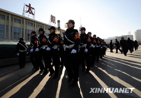 太原:一支由35名铁路女警组成的三八女子执勤队保和谐春运 来源:新华网 作者:燕雁 发布时间:2009-01-11 19:17:20 浏览次数: 次 【字体:小 大】 1月11日,三八女子执勤队的队员在挂牌上岗仪式上。 当日是全国春运开始的第一天,一支由35名铁路女警组成的三八女子执勤队在山西省太原火车站正式挂牌上岗,她们将以女民警特有的细心、热心、耐心和专心,在太原站担负执勤任务,为旅客提供服务。新华社记者燕雁摄 1月11日,三八女子执勤队的队员在挂牌上岗仪式上。新华社记者燕雁摄 1月11日,在太原火车站广场,三八女子执勤队的队员正在列队行进。新华社记者燕雁摄 智能标签: 女子执勤队 春运 相关内容 【打印正文】