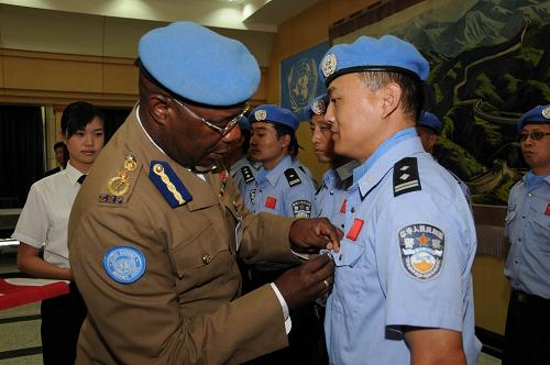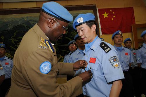 1月15日,在位于苏丹首都喀土穆的中国驻苏丹大使馆,联合国驻苏丹特派团警察部队特派员穆诺里亚瓦(左)向中国维和警察颁发勋章。联合国驻苏丹特派团当日向中国驻苏丹维和警察颁发“联合国勋章”,以表彰他们认真履行维和使命并做出杰出贡献。