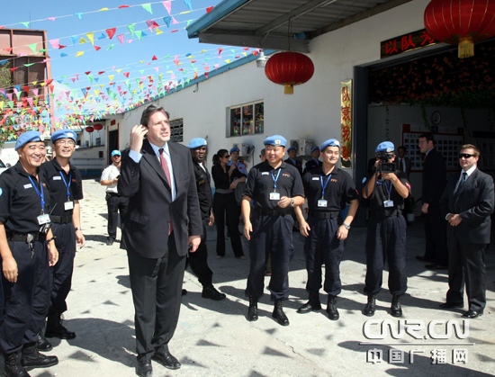 海地时间1月27日,联合国负责维和事务的副秘书长阿兰·勒罗伊在联合国秘书长驻海地稳定特派团特别代表海德·安纳比、首席副特别代表达·科斯塔、总警监玛玛都·迪亚罗、维和部队副司令里卡多·托罗、联合国维和行动部高级政治事务官员兰内特·阿哈梅德等联合国高级官员陪同下专程视察中国第七支驻海地维和警察防暴队,与队领导进行了座谈,参观了营区,慰问了125名维和队员,并与维和队员合影留念。