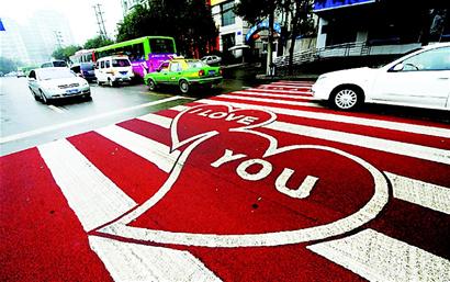 “爱情斑马线”印上“I LOVE YOU”。黄瑶 摄