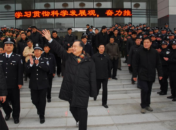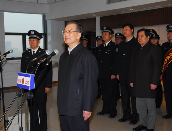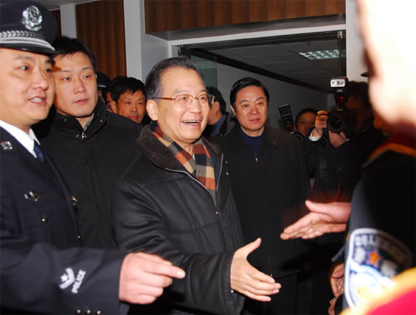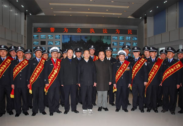 1月25日,正在四川看望慰问灾区人民的中共中央政治局常委、国务院总理温家宝,在四川省委书记刘奇葆、省长蒋巨峰等领导的陪同下,到德阳市公安局指挥中心看望慰问节日期间坚守工作岗位的公安民警,并通过指挥中心视频系统向全省公安民警表示亲切慰问。