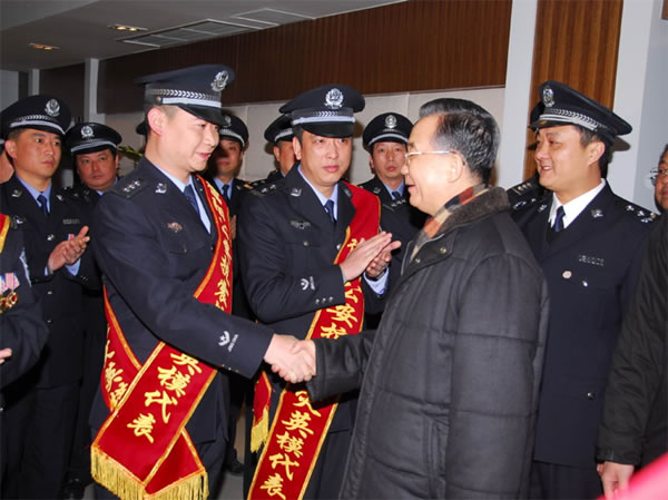 温家宝总理首先向全省公安民警、消防民警问好,并致以新年的问候。亲切接见了德阳市公安英模、公安消防英模代表,并合影留念。