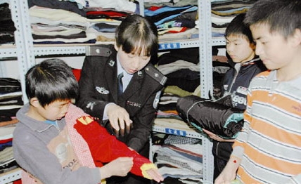 在尚义街万寿巷警区的“爱心警务超市”里,民警正在为辖区内贫困家庭的孩子挑选合身的衣服。