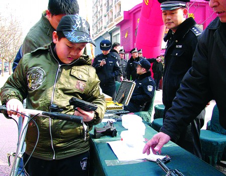 3月1日上午10点钟,在佳世客步行街上,公安部门收缴的单管猎枪、气步枪、仿真冲锋枪、气手枪、灭火类仿真枪、仿真手枪等引起了过往市民的浓厚兴趣,几位家长忍不住为孩子们亲手展示起来拆枪。当日上午青岛市公安局和各区市分局共设置了12处宣传点宣传“缉枪治爆”百日行动,并公布了市民私藏仿真枪、爆炸药品等的处罚依据,和群众举报涉枪涉爆违法犯罪奖励标准,抛出上限万元的奖励动员全民投入缉枪治爆行动。