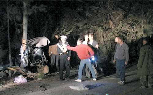 昨日凌晨2时左右,记者赶到事发现场,此时交警已拉起长长的警戒线。现场狼藉一片:出事轿车被撞成两截,两者距离5米开外,经过严重撞击已难辨认车身。在轿车行驶方向的右侧路边,一棵大树和石桩被撞断,交通指示牌也未能幸免于难,撞成麻花状。车辆挡风玻璃碎片散落一地,掉落在地上的还有一小袋大米和一只拖鞋。