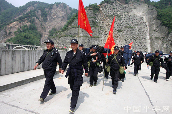 黄保卫局长和李幼夫支队长带头步行向汶川漩口镇急行军