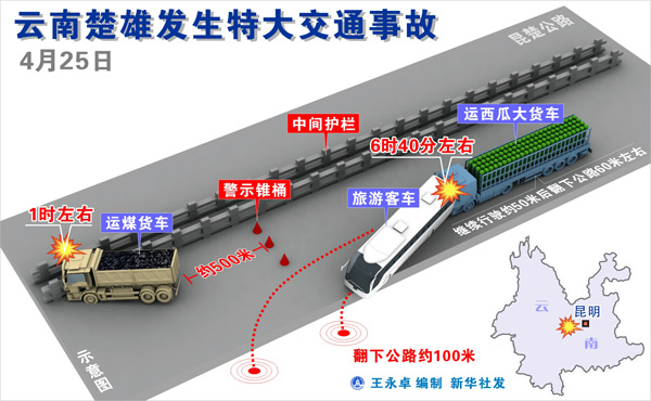 4月25日6时40分左右,云南省楚雄彝族自治州境内安楚高速公路孔家庄隧道外昆明方向约3公里处发生重大交通事故,一辆满载西瓜的大货车追尾一辆旅游大客车,先后冲过高速路护栏,翻落低于路面10余米的农田中,造成两辆车上的16人当场死亡,2人在送往医院途中死亡,3人在医院经抢救无效死亡,20人受伤。
