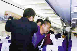 飞机继续飞行,客舱依然寂静,好像什么事都没发生,5分钟后,飞机安全降落。开舱门时,拿行李的旅客较多,秩序有些乱,两位空警紧跟着疑犯,在下客梯车后,他们眼神交换了一下,前扑,锁喉,铐牢……瞬间完成,下飞机的乘客甚至不知道刚刚发生了什么。