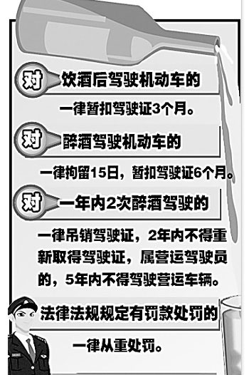 集中整治期间,公安交通管理部门将调集优势警力,针对高发区域和高发时段,高密度部署勤务,提高拦查频率,对有酒后驾驶嫌疑的车辆和驾驶人严格检查。对酒后驾驶的,将严格按照道路交通安全法的规定从严处罚,坚决做到“四个一律”:对饮酒后驾驶机动车的,一律暂扣驾驶证3个月;对醉酒驾驶机动车的,一律拘留15日,暂扣驾驶证6个月;对一年内2次醉酒驾驶的,一律吊销驾驶证,2年内不得重新取得驾驶证,属营运驾驶员的,5年内不得驾驶营运车辆;法律法规规定有罚款处罚的,一律从重处罚。>>>详细