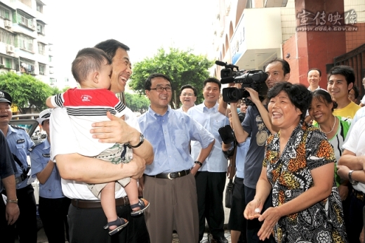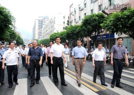 近日,中共中央政治局委员、重庆市委书记薄熙来,在市公安局党委书记、局长王立军陪同下,来到璧山县城郊派出所和巡警大队视察了公安基层所队工作,并走进群众中间,向当地群众了解璧山县社会治安情况和安全感状况。薄熙来视察时强调,公安基层所队一定要加强警民关系建设,要让犯罪分子感到害怕,让人民群众感到亲切,一定要和人民群众紧紧团结在一块,共同把我们的城市建设好。