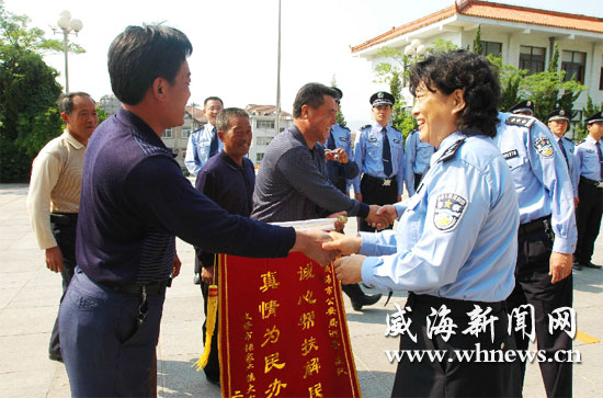 市巡警支队与文登市大官庄村结成帮扶对子后,积极帮助村里解难题谋发展,村民们送来锦旗表达感激之情。