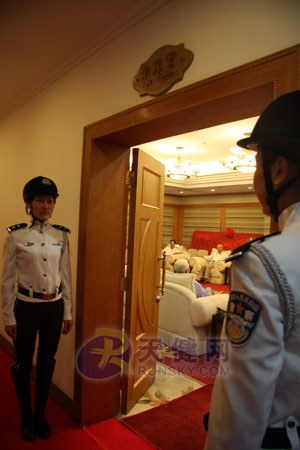 颁奖典礼前,守卫在贵宾室的女骑警。