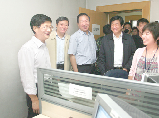 图为9月6日,国务委员、公安部部长孟建柱在乌鲁木齐市看望慰问新闻宣传一线工作人员。郝帆摄