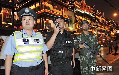 图为上海市公安局黄浦分局夜间联合武装巡逻队在老城厢豫园地区巡逻。陈扬 摄