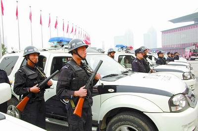 9月27日上午,在郑州国际会展中心广场,一队由20辆崭新的帕拉丁警车、40辆桑塔纳警车和120名头戴防弹头盔、身穿防弹背心、手持“七九”式微冲的全副武装民警组成的巡逻车队引起了市民的关注。