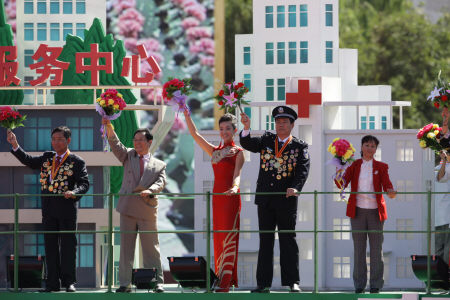 来自全国各地的近百名公安英模和先进集体代表也应邀来到天安门广场,参加新中国成立60周年庆典,与数十万群众一起为祖国庆生。他们有的在彩车上,有的在观礼台上,感受国庆庆典带来的幸福与欢乐。