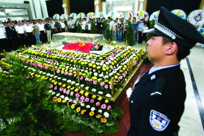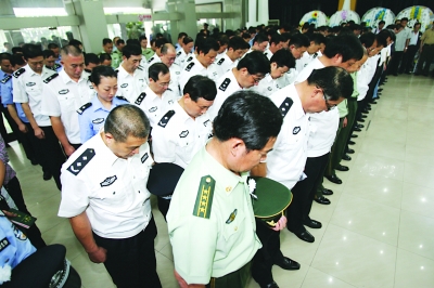 10月3日,山城下起蒙蒙细雨,老天也像在为一名英雄悲泣。石桥铺殡仪馆里一片低声抽泣,来自市公安局的数百名民警自发来到灵堂,为好战友送行……因过度劳累突发疾病、年仅39岁的市公安局研究室民警程明因突发蛛网膜下腔出血,倒在了我市国庆安保和打黑除恶第一线。闻此噩耗,中共中央政治局委员、市委书记薄熙来在追悼会开始前做出重要批示,称赞他是全市公安民警的榜样,公安部也发来唁电慰问。
