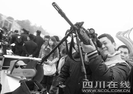 “爸爸,你看我这样帅不帅?”摸着展台上的88式狙击步枪,9岁的陈浩龙有些心痒痒。站在对面的警察好心地帮助他举起了重达10来斤的大家伙,并挂在了小浩龙的胸前。穿着红色外套的小伙子像模像样地端起狙击枪,对着远处做了个瞄准的姿势。帅气的小家伙吸引了众多市民拍照,大约是觉得不过瘾,小浩龙后来又玩起了一把95式机枪,“警察叔叔,这是真的机枪吗?”见警察点头,陈浩龙兴奋了起来。和陈浩龙一样,昨天还有好多市民现场第一次体验了一把“玩真枪”的感觉。“真枪有手感多了,这回算是大开眼界了。”住在武侯区的市民刘先生端着手枪,专门让同伴用手机给自己拍了张帅照。