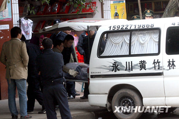 2009年12月21日,工作人员正在将永川劫持人质事件中的受害者尸体运走。新华社记者 周衡义 摄