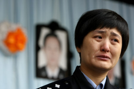 公安部交通管理局办公室主任石勇流着泪走出灵堂。来之前,他本想强忍悲痛留给英雄们一个微笑,可是刚一走进灵堂便泣不成声:”他们都是我们的领导、同事、战友,身边的同事们都十分悲痛。尤其是朱晓平局长,那么挺拔英武的领导,很有人格魅力……”