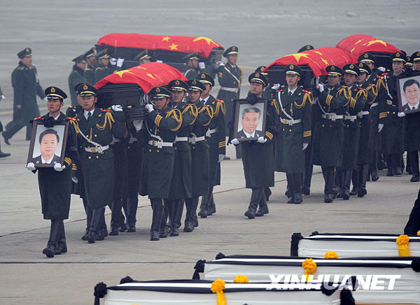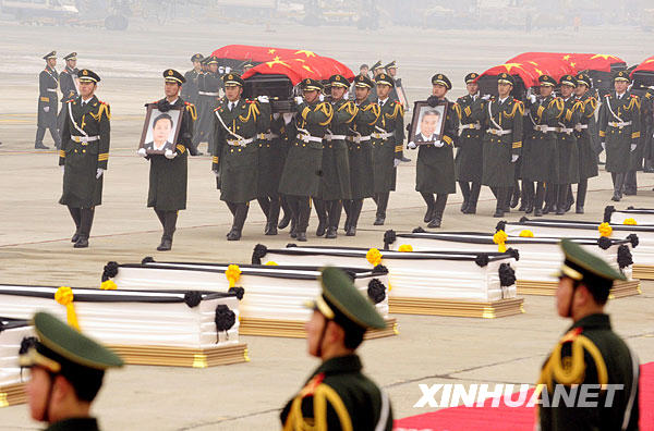 1月19日,礼兵护送八位烈士的灵柩,灵柩上覆盖着中华人民共和国国旗。当日,专程接运在海地地震灾害中遇难的八位中国维和警察灵柩的专机抵达北京首都国际机场。新华社记者金良快摄 |