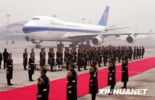 1月19日,专程接运在海地地震灾害中遇难的八位中国维和警察灵柩的专机抵达北京首都国际机场。新华社记者张铎摄
