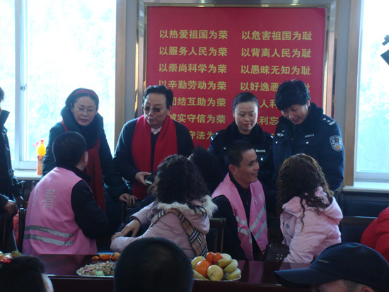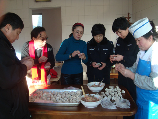 为了让五百多在押人员愉快地度过新春佳节,戴晓军所长带领全所干警没日没夜的辛劳。巡察监号,问寒问暖;置办年货,安排探视;组织在押人员排练“丹看山寨春晚”;带身体不适的在押人员去医院;分发小食品,预备年夜饭;为生活困难的在押人员家属送粮送油……常挂在戴所长嘴边的一句话是“俺家那五百口子”;工资本来就不高的李晓兰、艾丽、于易霖等男女管教自己掏钱为在押人员精心选购了袜子内衣脚套等新年礼物,还买来灯笼、拉花把监号布置得喜气洋洋;管教魏红召和妻子赵云英在家为在押人员包好饺子,在除夕夜煮熟后热腾腾的送到监所,让在押人员在思亲的节日里感到了家的温暖……面对这感人的一切,两位作家不能不激动。