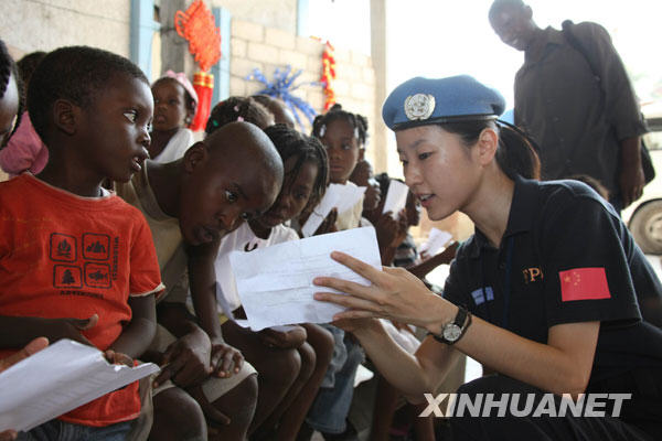 维和警花献爱心 来源:新华网 作者:施金东 发布时间:2010-03-08 07:57:38 浏览次数: 次 【字体:小 大】 3月6日,在海地首都太子港“小天使”孤儿院,中国赴海地维和警察防暴队队员杨彬给孩子们发放食品。 该孤儿院位于中国防暴队经常执勤的区域。防暴队女队员给孤儿院送去了生活物资和文体用品,通过帮助这些无家可归的孤儿的方式纪念第100个“三八”国际劳动妇女节。 3月6日,在海地首都太子港“小天使”孤儿院,中国赴海地维和警察防暴队队员王润泽教孩子们唱歌。新华社发(施金东摄) 智能标签: 维和警花 相关内容 【打印正文】