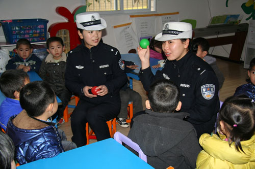 警花陶唯和陈潞是辖区“春天花花”幼儿园的常客,这不,她们又来给小朋友们上交通安全课了