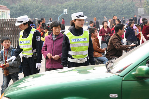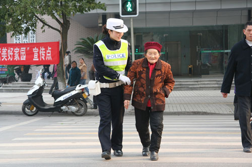 “严格执法,热情服务”是警花们工作的宗旨。执勤中扶老携幼是她们的常事