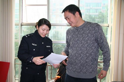 警花在开展的“大走访”爱民实践活动中,征求企业领导的意见