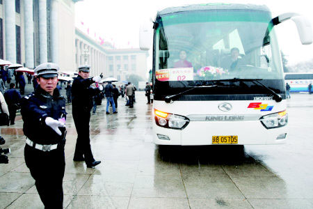 3月14日,北京交警在人民大会堂前引导两会车队。本报记者张建鑫摄