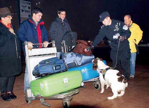 世博会试运营安保在即。北京市公安局机场分局4月1日作出详细部署,即日起,首都机场将全面加强机场辖区巡逻防控力度,巡逻车组24小时巡逻,机场各出入口昼夜设卡盘查。图为特警队员携警犬在航站楼附近对过往乘客的行李实施抽检。法制日报 李松 黄洁 刘莉 摄
