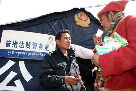记者在设在格萨尔王广场的县公安局指挥部的帐篷里看到,里面只有一张桌子加几张行军床,民警正在耐心地解答群众提出的问题。指挥部外面设立了醒目的报警台。玉树警方告诉记者,他们正在抓紧从已成危房的办公楼里抢挖急需的办公设施。