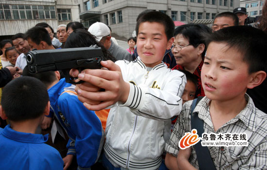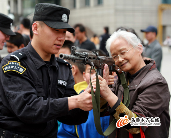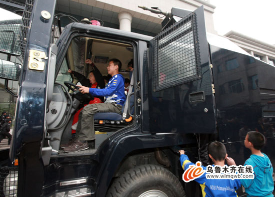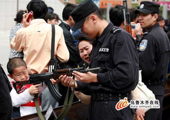 跟全副武装的“飞虎队”特警合影、登上攀登突击车感受一下救援的紧张感、看网枪现场表演抓捕“罪犯”……5月22日11时30分,乌鲁木齐市公安局首次大规模面对市民开放警营,展示形象。