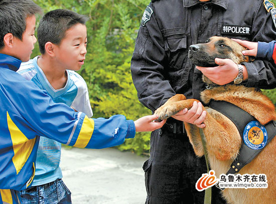 在记者的一再要求下,训练它的特警才同意让记者去抚摸一下它的头部。可当记者刚一靠近,巴鲁一下跳了起来,似乎在向记者示威:我还没同意呢。