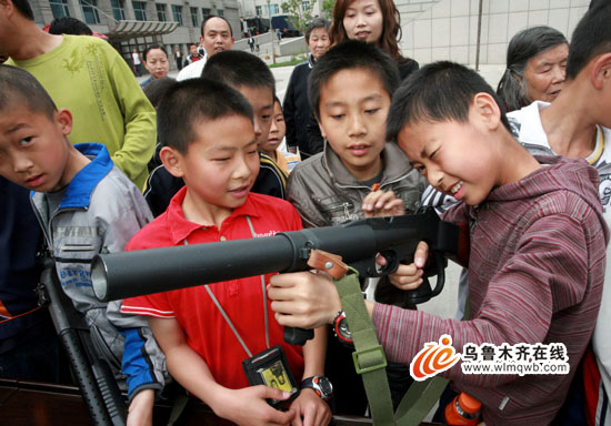 67岁的老太太舒锦轮是陪7岁的孙子来参观的,看到79式微型冲锋枪,老人忍不住拿在手上掂了掂。在孙子的鼓动下,老人摆出了一个射击的姿势,惹得周围的参观者不停地回头观看。