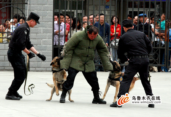 图为警犬表演抓捕“罪犯”。(记者刘新华摄)