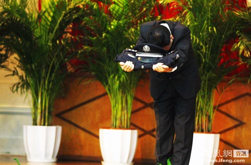 原市局刑警总队二支队副支队长郑某手托警服警帽向全场鞠躬。