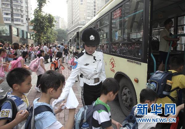 2010年6月17日 重庆女子交巡警队伍正式上岗执勤 6月17日,女子交巡警队员护送小朋友上车。当日,重庆市交巡警女子特勤支队正式上岗执勤,共设立5个早晚高峰手势指挥岗、5个“护校岗”和8个巡逻纠违小组。 新华社记者 陈诚 摄