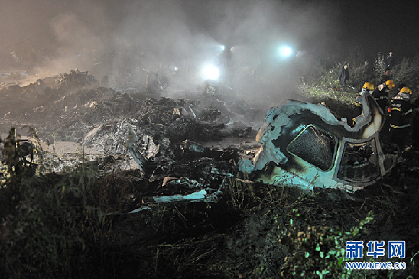 8月25日凌晨,救援人员在失事飞机残骸边开展救援工作。新华社发(王志富摄)