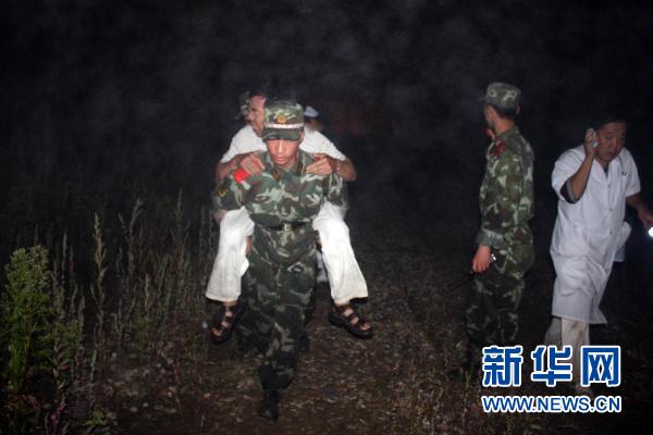 8月24日晚,伊春森警官兵背着一名坠机生还者送医救治。新华社发