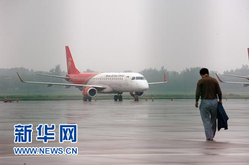 8月25日,一架河南航空的客机停在郑州新郑国际机场。河南航空原定25日执行的航班全部取消,何时恢复尚需等待通知。据河南省民航发展建设委员会办公室新闻发言人吴振坤介绍,河南航空现有5架飞机,型号全部为EMB190,其中失事飞机由哈尔滨机场长期包租,另有3架在郑州,1架在南宁。新华社记者 赵鹏摄