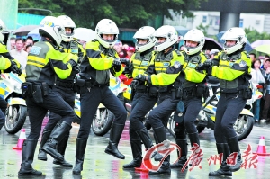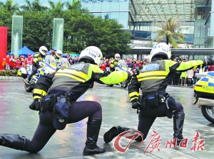 在广场中央的表演区,10名头戴钢盔、身穿制服的交警机动大队的帅哥们先来了段特技摩托车表演。他们驾驶着1300cc排量的大型警用摩托车娴熟默契地进行阵型变换、特技驾驶等表演,博得市民的赞叹和阵阵掌声。