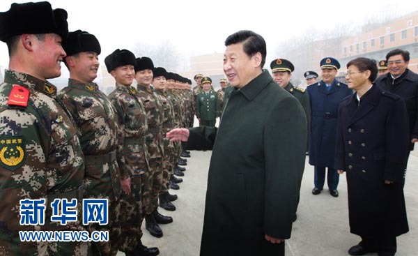 上午,习近平冒着严寒来到武警北京市总队十三支队,观摩了紧急出动演练,察看了部队装备,详细了解新兵训练和生活情况。在武警北京市总队作战勤务值班室,习近平与天安门广场国旗哨兵视频通话,他叮嘱哨兵注意防寒保暖,勉励大家牢记职责、不辱使命,用实际行动捍卫国旗尊严,维护国家形象,为党和人民再立新功。下午,习近平来到武警总部机关,接见了团以上干部,参观了武警部队警史馆。他还通过作战勤务网络查勤系统,察看了青藏铁路无人区、福建宁德核电站、广东拱北海关等执勤点,并通过视频系统向正在青海、甘肃、四川等地执行任务的武警部队官兵表示慰问,勉励大家增强政治意识、大局意识、使命意识、责任意识,扎实有效做好维护社会稳定工作,为地方繁荣发展和长治久安作出新的更大贡献。